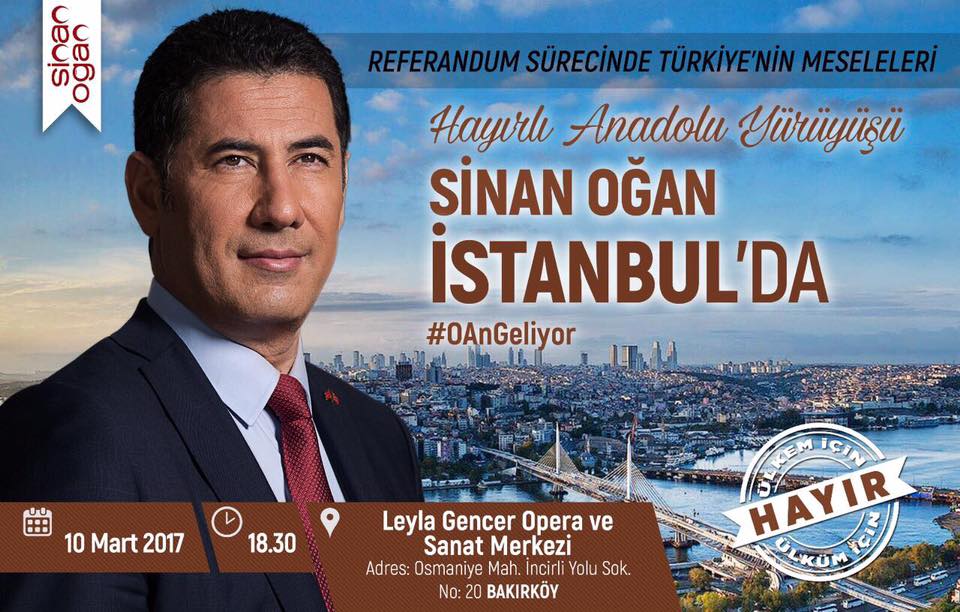 Milliyetçi Hareket Partisi Genel Başkan Adayı Sinan OĞAN, bugün (10 Mart 2017) saat 18.30’da İstanbul’da Leyla Gencer Sanat ve Opera Merkezi’nde konuşacak.