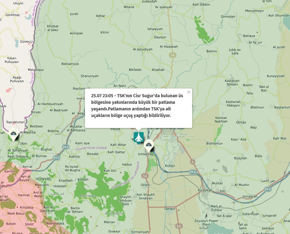 TSK’nın Cisr Sugur’da bulunan üs bölgesinin yakınlarında büyük bir patlama yaşandı. Patlamanın ardından TSK’ya ait uçakların bölge uçuş yaptığı bildiriliyor.