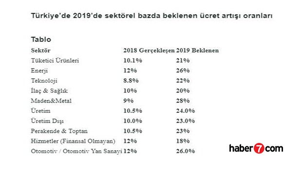 Bazı şirketlerde özel sektördeki zam oranlarına ilişkin çalışmalar yürütüyor. Bu şirketler arasında ise Mercer geliyor. Mercer’in yaptığı araştırmaya göre, özel sektörün Eylül 2018’de yüzde 16 olarak öngördüğü 2019 ücret artış oranı beklentisi, Ekim 2018 itibariyle ortalama yüzde 22 olarak belirlendi.