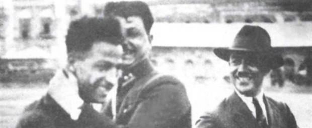 Bekir Refet, Slavia maçında attığı gol sonrası, sevincini saha kenarındaki bir subay ve Fenerbahçeli yönetici Ali Naci Karacan ile paylaşıyor…Ancak Bekir Refet, 1921 yılında tekrar Fenerbahçe’ye dönmüş ve Galatasaray’ın Avrupa turnesine takviye eleman olarak dahil olmuştu.