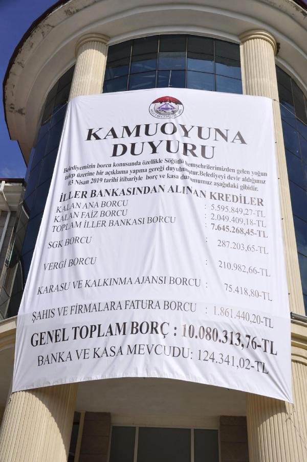 Yaklaşık 20 bin nüfuslu ilçenin belediye binasına asılan afişte iller bankasına 7 milyon 645 bin 268 lira borç, SGK’ya 287 bin 203 lira borç, vergi borcu 210 bin 982 lira, Karasu ve Kalkınma Ajansı borcu 75 bin 418 lira, şahıs ve firmalara ise 1 milyon 861 bin 440 lira borç olarak listelendi. Afişte, toplam borcun 10 milyon 80 bin 313 lira, kasa ve banka mevcudunun ise 124 bin 341 lira olduğu belirtildi.