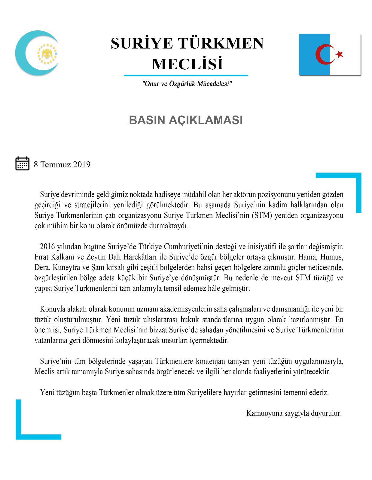 Suriye Türkmen Meclisi Başkanı Muhammed Vecih Cuma, Suriyeli Türkmenlere vatanlarına dönme çağrısında bulundu.Suriye Türkmen Meclisi’nin Gaziantep’teki şubesinde düzenlenen toplantı sonrası Başkan Muhammed Vecih Cuma, açıklamalarda bulundu. Meclisin bizzat Suriye’de sahada olacağını kaydeden Cuma, “Suriye’de Türkiye Cumhuriyeti’nin desteği ve inisiyatifi ile şartlar değişmiştir. ‘Fırat Kalkanı’ ve ‘Zeytin Dalı’ harekatları ile Suriye’de özgür bölgeler ortaya çıkmıştır. Hama, Humus, Dera, Kuneytra ve Şam kırsalı gibi çeşitli bölgelerden bahsi geçen bölgelere zorunlu göçler neticesinde özgürleştirilen bölge, adeta küçük Suriye’ye dönüşmüştür. Bunlardan dolayı Suriye Türkmen Meclisi’nin tüzüğünü değiştirdik. Tüzük değişikliği, meclisin bizzat Suriye’de sahadan yönetilmesini ve Suriye Türkmenlerinin vatanlarına geri dönmesini kolaylaştıracak unsurları içermektedir. Suriye Türkmen Meclisi’nin bu karar ile ana stratejisi, vatana dönüşmüştür. Artık bizim ana karargahımız Ankara’da değil, Suriye Çobanbey’de olacaktır” dedi. Türkmenlerin Suriye’ye dönüşünü hızlandırmak istediklerini dile getiren Suriye Türkmen Meclisi Genel Koordinatörü Cemil Doğaç İpek ise “Uluslararası hukuk standartlarına uygun olarak yeni bir tüzük ortaya çıkarıldı. Bu tüzükle meclisimiz artık Suriye’nin Halep kentinin Çobanbey bölgesinde sahada faaliyet gösterecek. Bunun en önemlisi ise Suriye Türkmenlerinin Suriye’ye dönüşünü hızlandırmaktır. Bu kapsamda Türkiye’nin desteği ile eğitim, sağlık, iş konularında da çok güzel projelerimiz var” dedi.