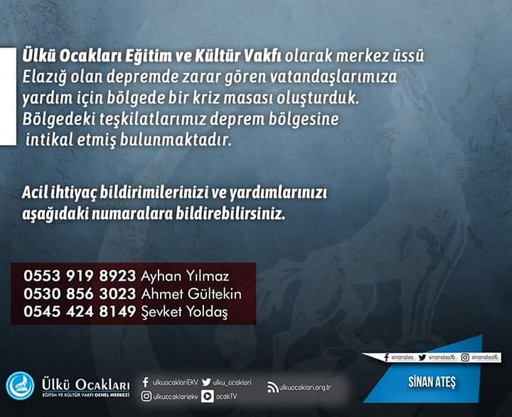 Ülkü Ocakları Eğitim ve Kültür Vakfı olarak merkez üssü Elazığ olan depremde zarar gören vatandaşlarımıza yardım için bölgede bir kriz masası oluşturduk. Bölgedeki teşkilatlarımız deprem bölgesine intikal etmiş bulunmaktadır.