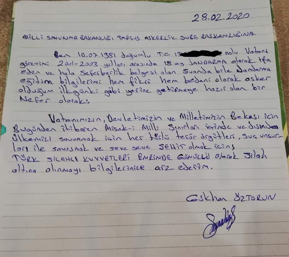 Dilekçesinde vücut ve bilgisiyle askerliğe elverişli olduğunu belirten Öztorun; bir vatansever Ülkücü olarak, Türk Ordusu’nun vereceği her görevi seve seve yapacağını belirtmiştir…