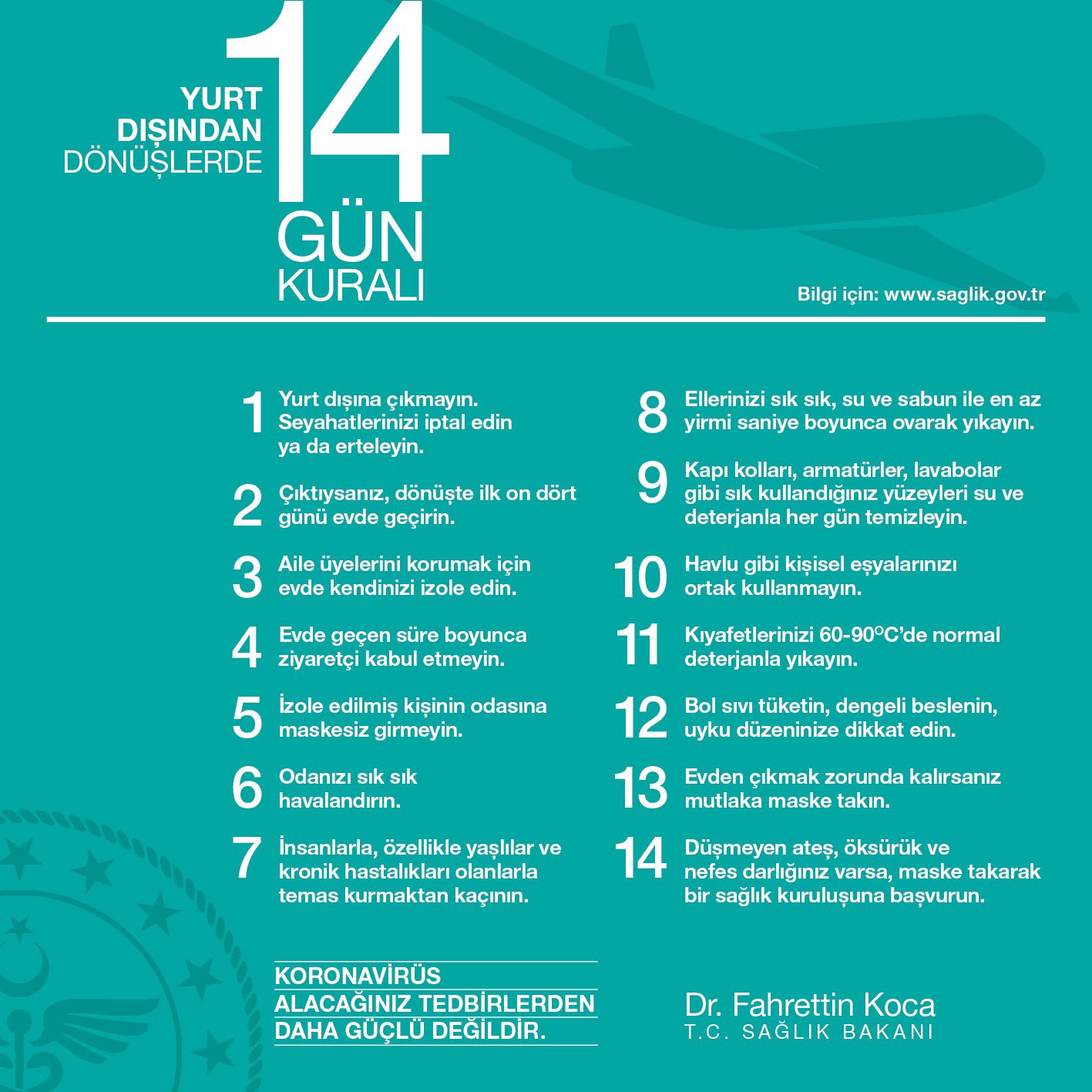 Umre’den yeni döndüyseniz “14 Gün Kuralı”na uymanızı ısrarla istiyoruz. Son bir hafta içinde dönen bir yurttaşımızın testi maalesef pozitif çıktı. Yeni vakalardan endişeliyiz. Lütfen ziyaretçi kabul etmeyin. Sağlık taramasından geçmiş olmak sıfır risk anlamına gelmez.