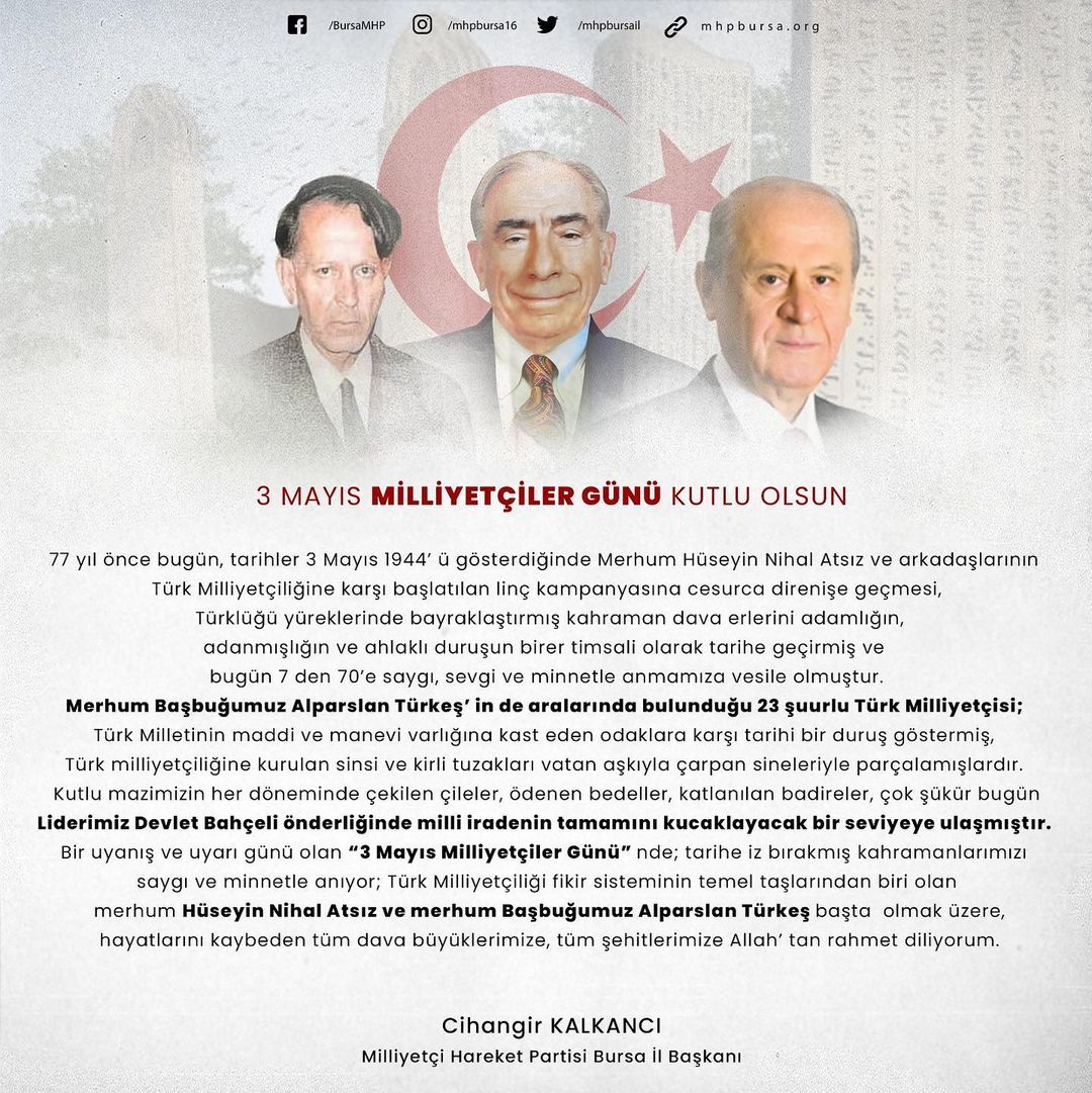 Milliyetçi Hareket Partisi (MHP) Bursa İl Başkanı Cihangir KALKANCI, 3 Mayıs Milliyetçiler Günü olması münasebetiyle bir mesaj yayınladı.