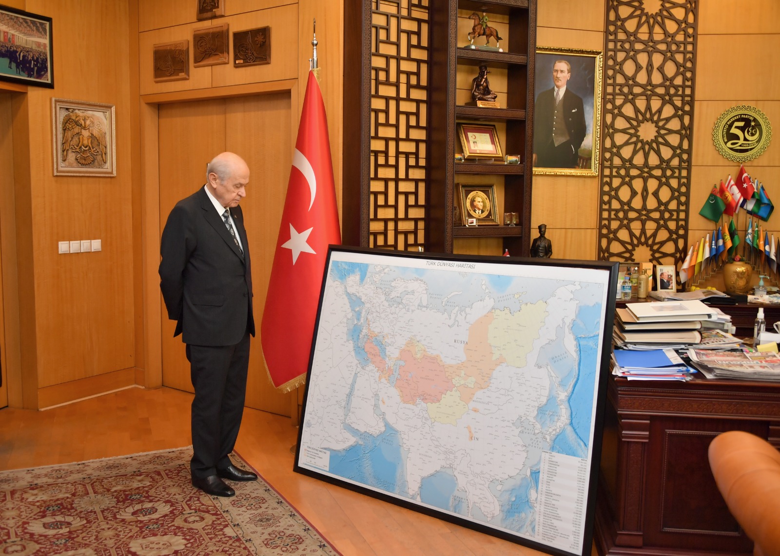 Bu vesileyle, MHP Lideri uzun bir süredir üzerinde çalıştığı, özel olarak tasarlayıp çizdirdiği Türk Dünyası Haritasını da Türklüğün vicdanına, Türk milletinin yüksek irfanına elden ele taşınacak bir bayrak gibi emanet etmiştir.