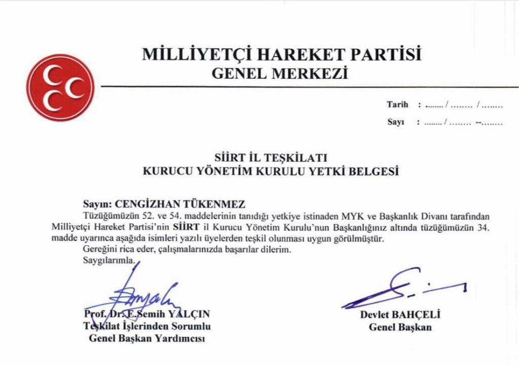 Siirt iş dünyasının önemli isimlerinden olan Cengizhan Tükenmez, MHP Genel Başkanı Dr. Devlet Bahçeli tarafından İl Başkanı olarak görevlendirildi.