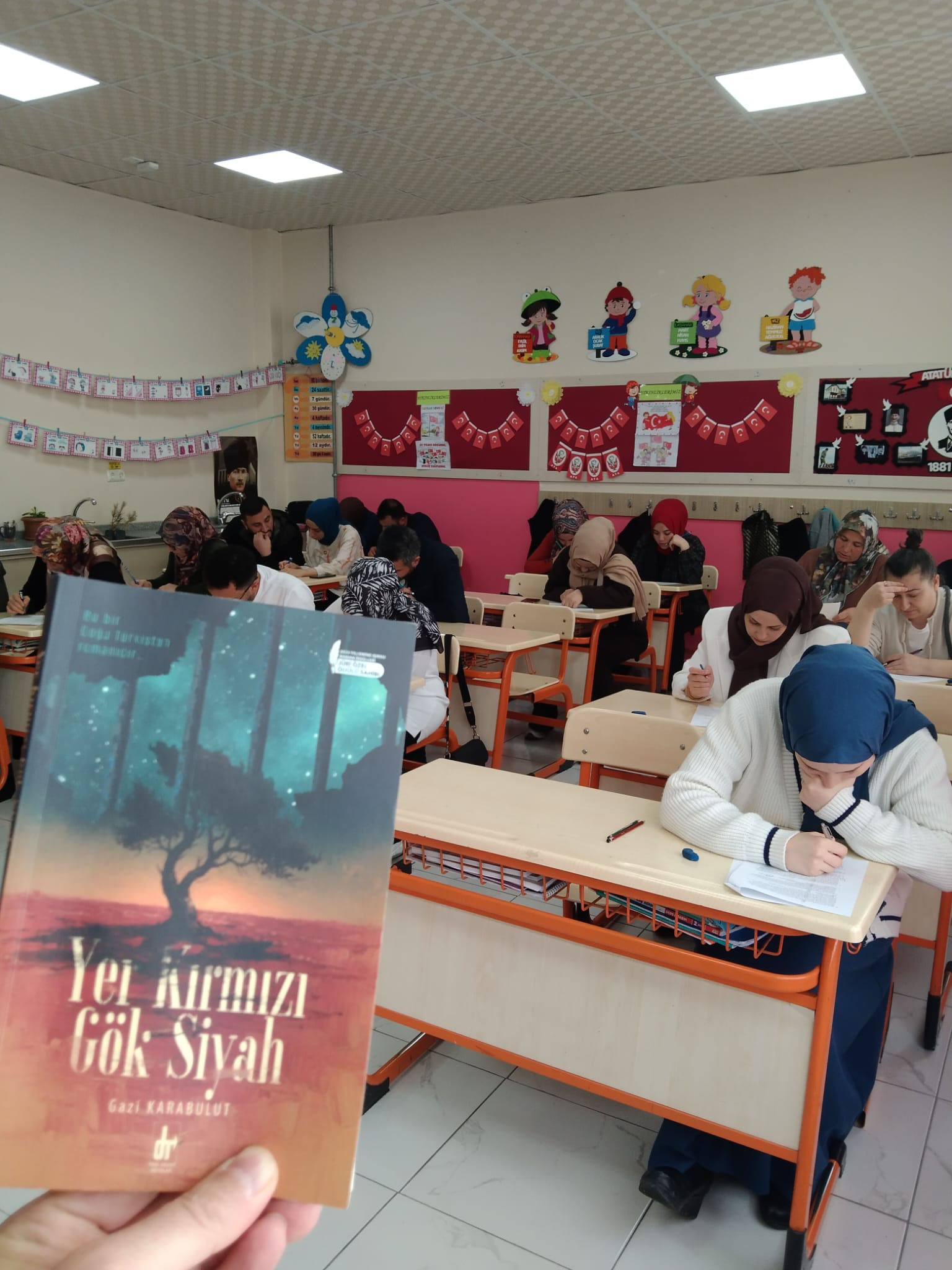 Etkinlikte sınıf Öğretmeni Gazi KARABULUT’un Yer Kırmızı Gök Siyah adlı Doğu Türkistan’da yaşanan soykırımı anlattığı 2025 Emine Işınsu Roman Yarışması Jüri Özel Ödülü alan romanını okuyan veliler kitap ile ilgili sınava girerken öğrenciler de şiir ve resim çalışmaları yaptılar.